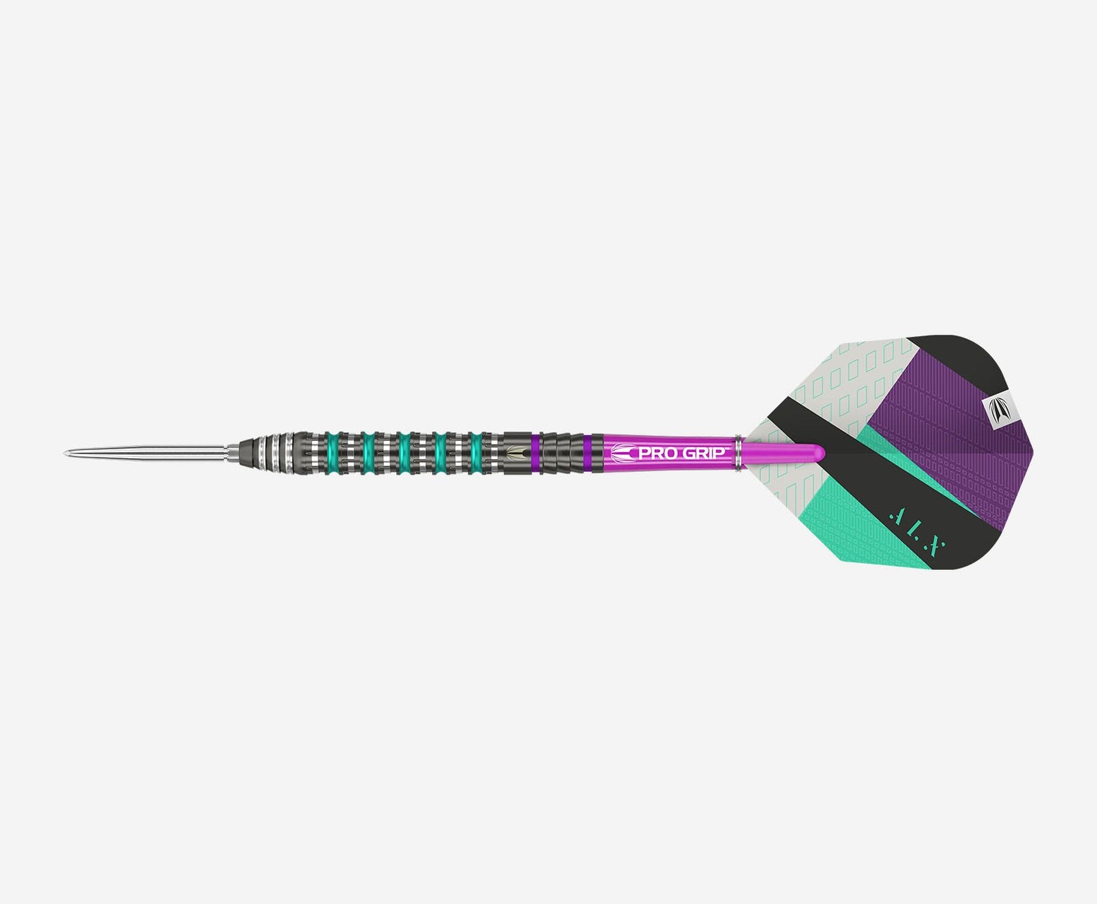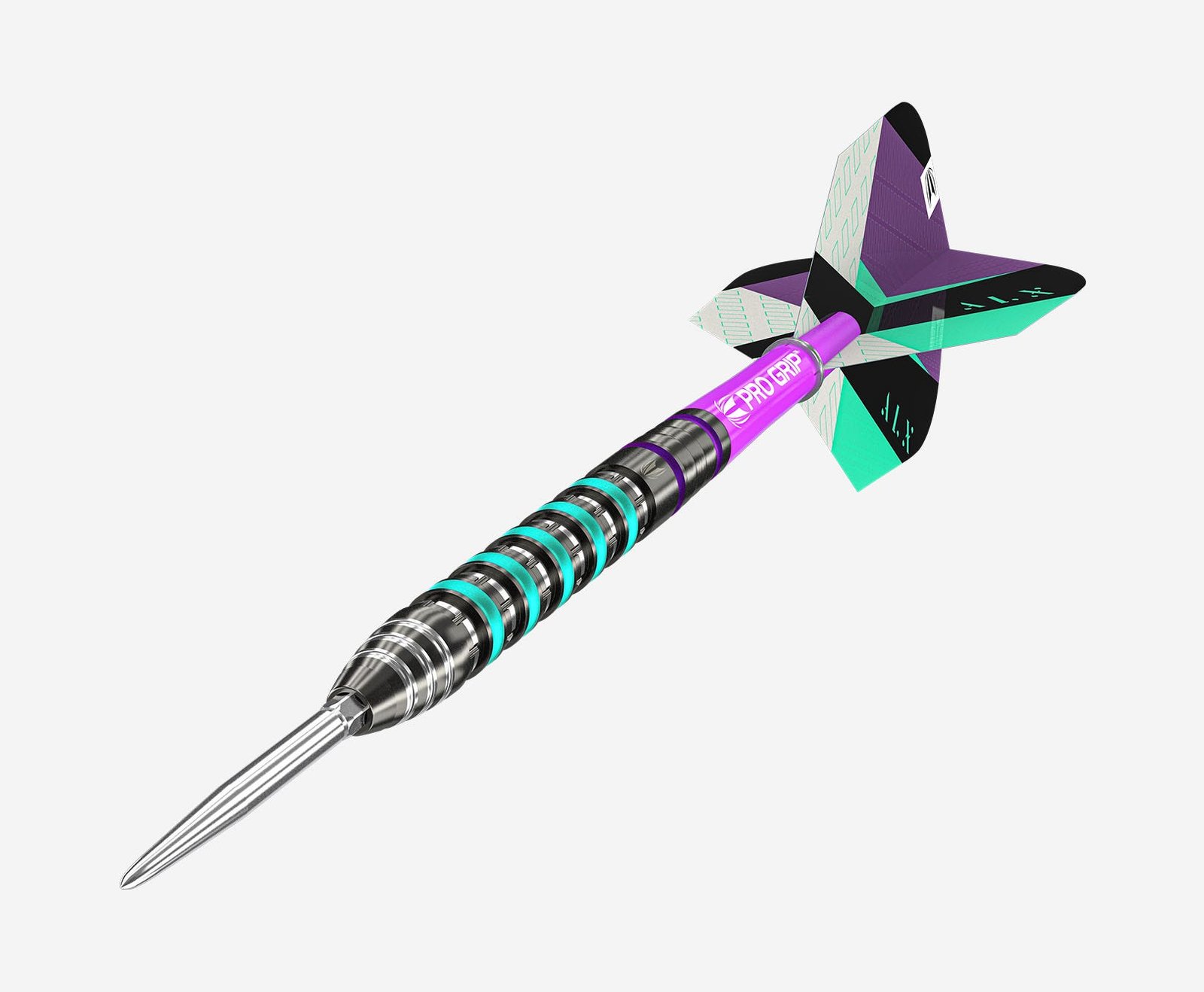 Each 90% tungsten barrel offers stunning precision milling throughout with a combination of vibrant strikes of aqua and purple colour, overlaid with black titanium nitride performance coating.