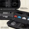 The case holds up to 6 fully assembled darts, meaning no need to disassemble between games. An internal tray system provides organised storage for 12 dart shafts and 15 Swiss Point tips, while additional compartments accommodate flights, K-Flex accessories, Swiss Point tools, and other must-have essentials.