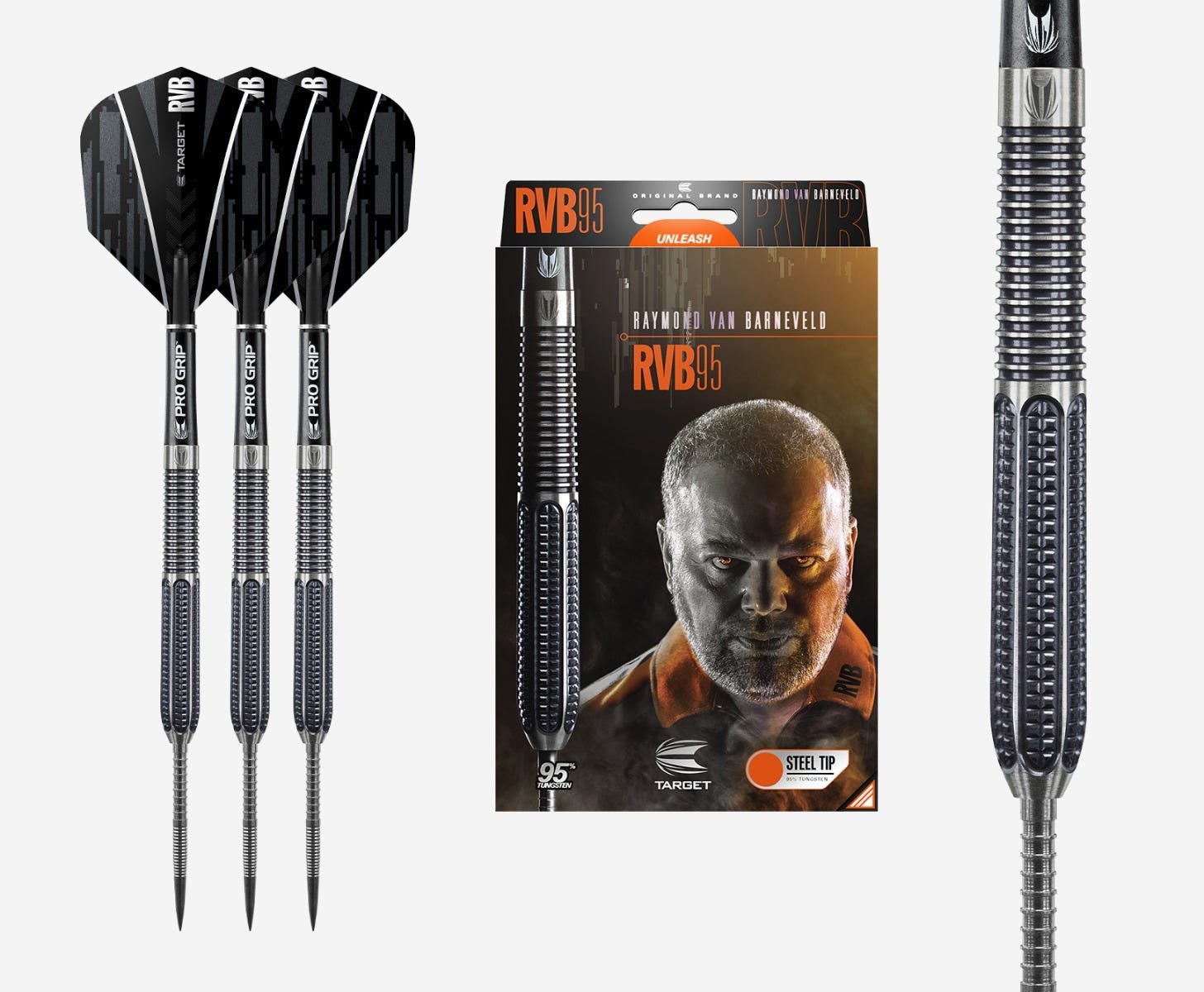 The RVB 9Five Generation 1 from Target Darts. The RVB 95 G1 dart has been developed with Target’s team of designers to produce excellent results for the 5 x World Champion’s unique throw. Cut with a combination of trapezoidal milling at the front end and contrasting radial grooves at the back. Black titanium coated, and fitted with Target Firepoints.