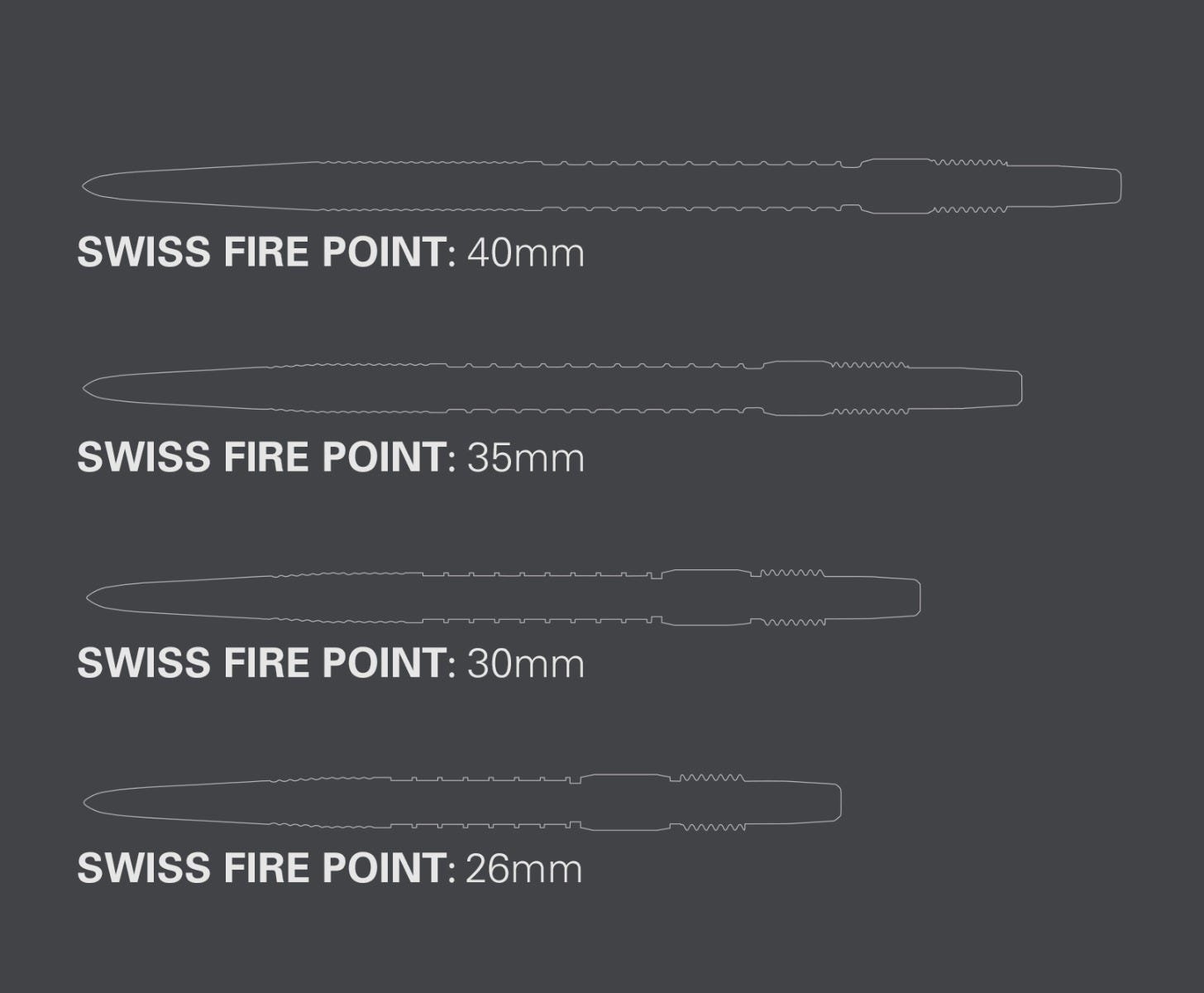 The Swiss Fire Points combine Target’s patented Swiss Point technology with a bold, precision-machined profile for enhanced control and consistency. The design features a ringed grip through the middle section, transitioning to finer rings towards the front, and a smooth tip for clean, effortless dartboard entry.